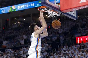 本场比赛,雷霆内线霍姆格伦表现出色,攻防两端都打出影响力,首发出战28分钟,投篮14中8,三分球5中1,罚球2中2,拿到19分9篮板(4前场篮板)1助攻2抢断2盖帽的数据,正负值+13。